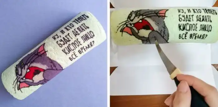 2. «Торт в честь увольнения коллеги с изображением его самого часто используемого стикера»