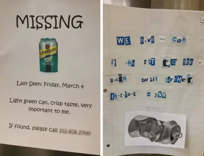 Cлева: «Пропала. Последний раз ее видели в пятницу, 4 марта. Светло-зеленая банка, газированный вкус, очень важна для меня».