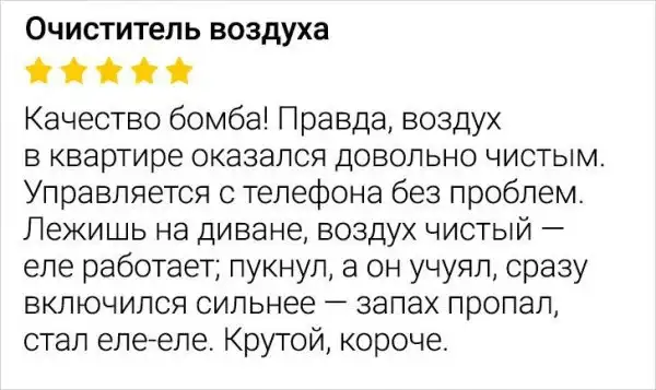 Порой отзывы покупателей в интернет-магазинах способны затмить сам товар. Возможно их мини обзоры сложно назвать очень информативными и полезными, но зато они отлично поднимают настроение. Пользователи вложили в отзывы весь свой креатив и позитив.