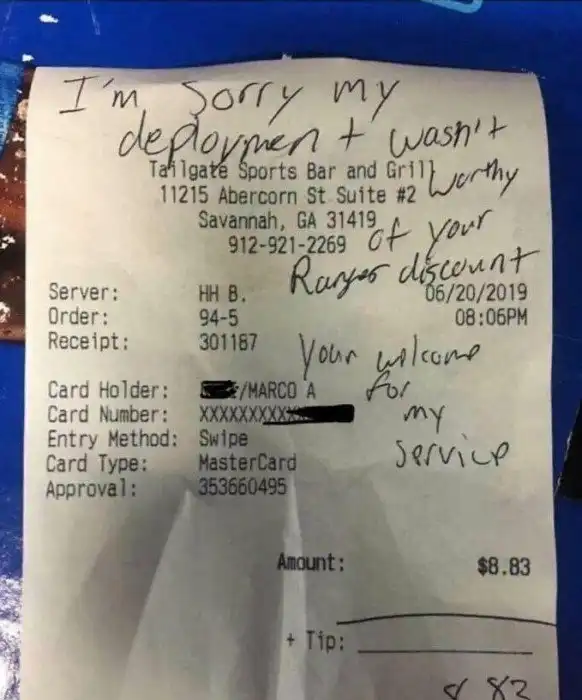 "Мои чаевые - это ваша свобода, которую я защищаю на военной службе".