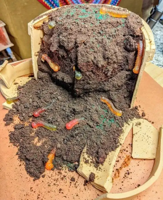 11. «На 3-летие дочери я приготовила торт в виде разбитого цветочного горшка с землей»