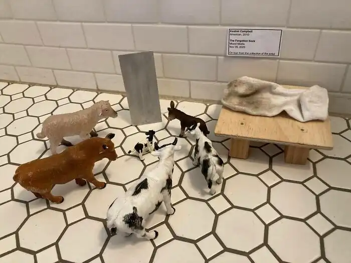 "Как-то я заметила в ванной неубранный носок Кестрел, - рассказывает она. - Я решила, что не буду, как всегда просто отправлять его в стирку, а подожду, пока она сама его заметит. Но прошла неделя, а носок продолжал лежать на том же месте. Я не выдержала. Когда Кестрел ушла в школу, я снабдила носок табличкой: "Кестрел Кемпбелл, США, 2010 г.р. "Забытый носок". Смешанная техника. 26 ноября 2020г. Из личной коллекции художника".