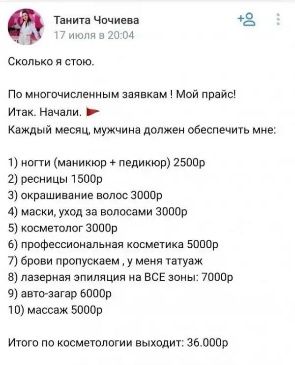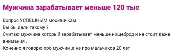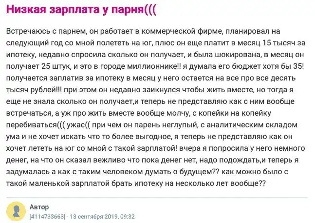 Можно подумать, что это фейк, однако полистав подобные темы на женских форумах, оказалось, что большинство девушек придерживаются такого же мнения. Сколько же в итоге должен зарабатывать мужчина, чтобы подходить горе-содержанкам? 300 тысяч? 500? Им всегда будет мало!