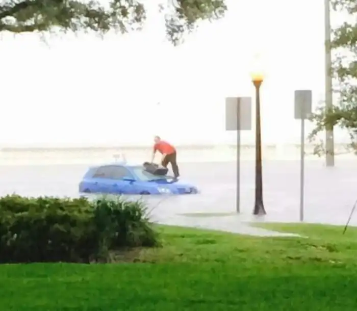 Работник доставки застрял на затопленной дороге, но все же спас пиццу.