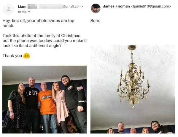 Мы сделали фото на Рождество, но телефон был слишком низко. Можешь сделать так, чтобы казалось, что фото сделано с другого угла?