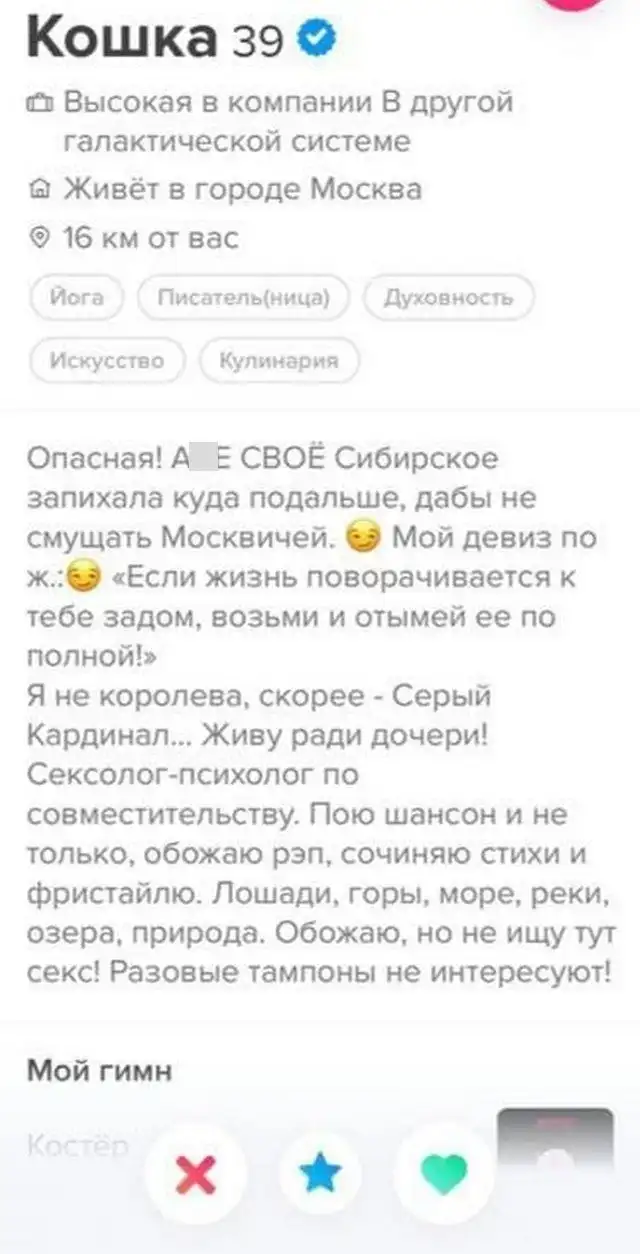 Очередная порция безбашенных анкет, которые публикуют пользователи для привлечения внимания к своей персоне. Они пытаются выделиться - кто фото, кто описанием, кто чем-то другим... И найти вторую половину.