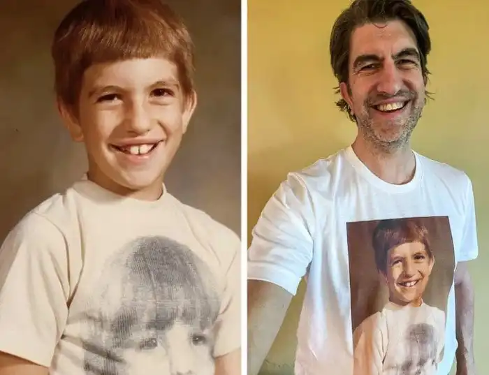 «Примерно 3-й класс, 1980 год. Папа подстриг меня, и я надел футболку со своим портретом. Для сравнения: вот я взрослый»