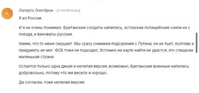 Сообщается, что шесть британских солдат ехали в поезде в латвийский приграничный город Валка. По пути они приняли спиртные напитки и распугали других пассажиров. Контроллер не смог их остановить, поэтому вызывал полицию, которая сняла дебоширов. Английские СМИ считают, что к этому могут быть причастны русские, которые дискредитируют НАТО.