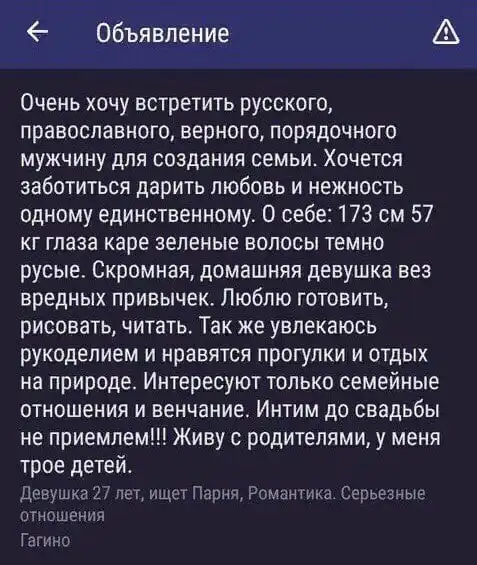 Заводить отношения с разведенной девушкой, у которой есть дети от прошлых отношений? Эта тема довольно активно обсуждается на просторах всемирной паутины. А девушки продолжают искать свою вторую половинку. Есть нормальные дамы, а есть и не очень - предъявляющие жесточайшие требования к мужчинам. И объясняют они такие требования наличием детей. В этой подборке есть как нормальные девушки, так и более наглые.