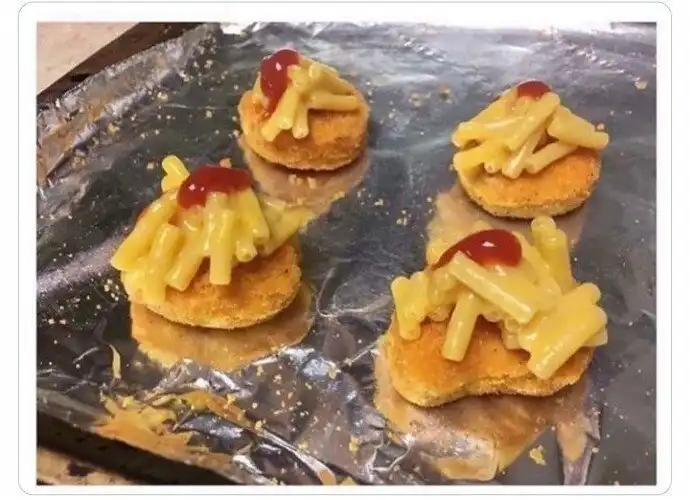 Если бы существовал конкурс на самую уродливую ресторанную еду, у этих наггетсов с пастой и томатным пюре был бы шанс