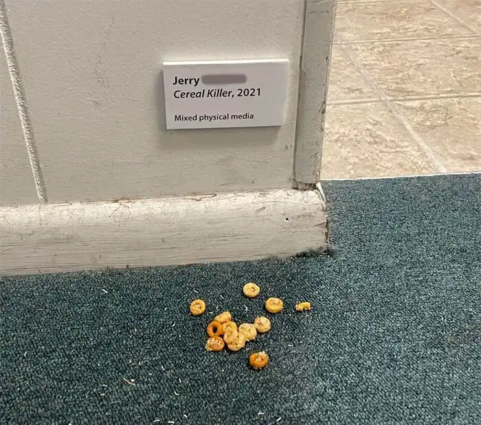 1. "Мой коллега имеет привычку проливать свои хлопья с молоком утром, выходя из кухни, и просто оставлять их на полу. Я превратил это в современное искусство"