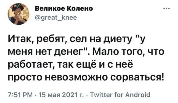 Хорошо людям без денег. Ведь если нет денег, то нет еды. Нет еды? Нет лишнего веса.