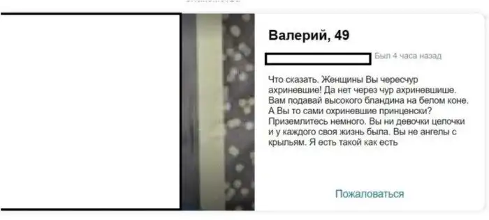 5. Мужчины, пожалуйста, не нужно в анкетах ругать женщин. Понимаю, что вы возмущены меркантильность, огромными губами, силиконом, толстыми попами и прочим, прочим. Но зачем всем это слушать? Ведь обычная, хорошая женщина примет все ваши эмоции на своей счет и пройдет мимо. Вы об этом не думали?
