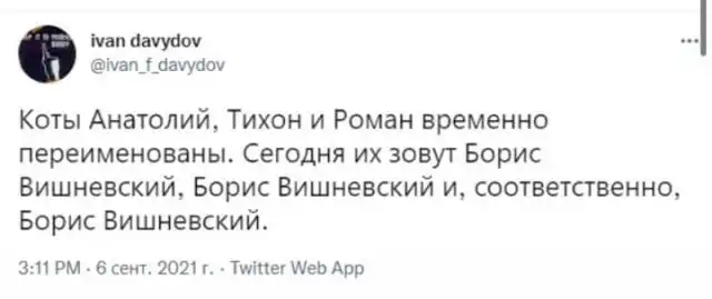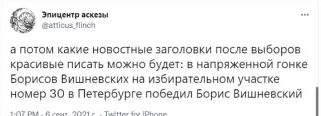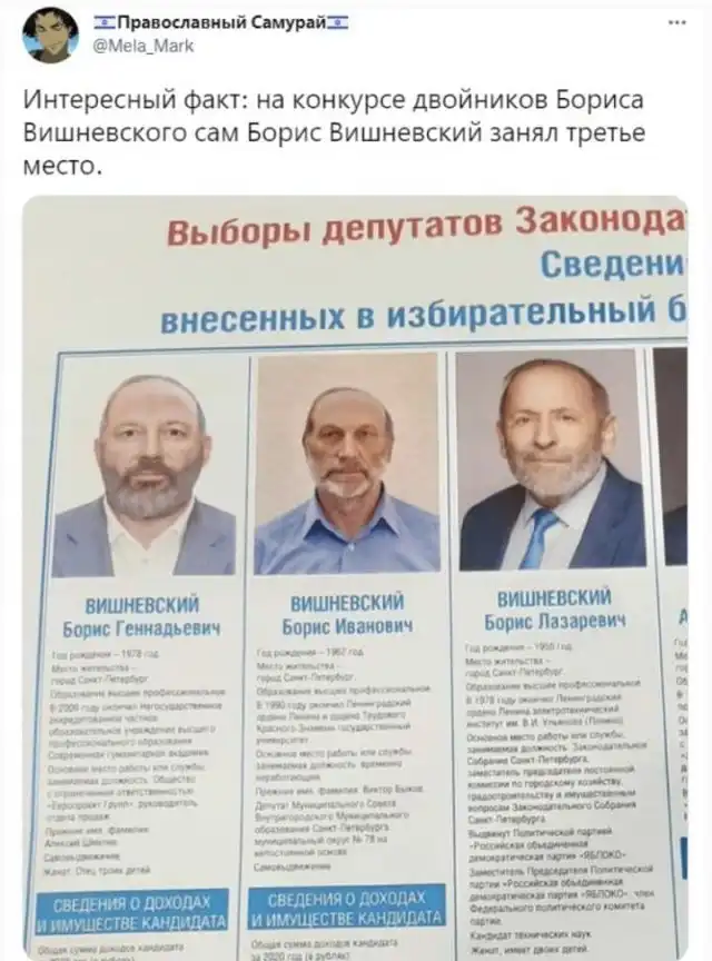 В Петербурге готовятся к выборам в Законодательное собрание. И уже несколько лет там есть оппозиционный депутат Борис Вишневский - уважаемый человек, правда, в последнее время он мешает жить: выступает за проведение митингов, сохраняет исторический центр города, не дает строить новые здания из стекла и выступает за права пенсионеров и тех, кто в этом нуждается. Сначала его не хотели регистрировать, но он пролез в последний вагон - теперь же у него появились двойники: двое мужчин с такими же фамилиями и такой же внешностью (как выяснилось, бороды им пририсовали).