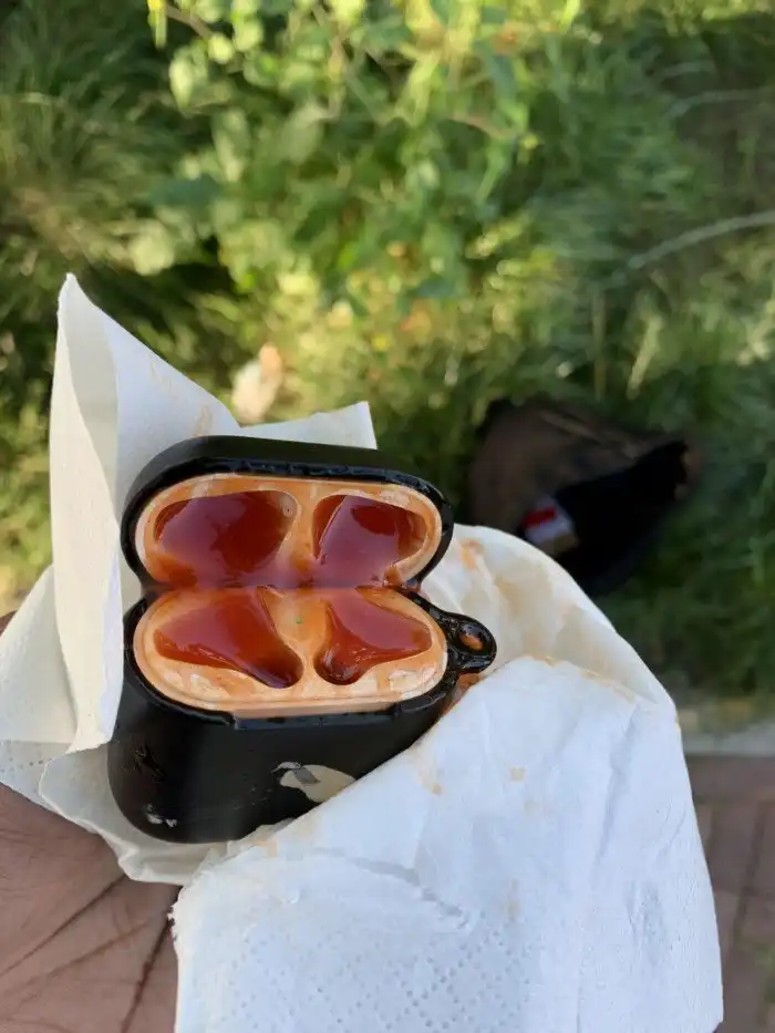"У меня в сумке взорвалась бутылка остро-кислого китайского соуса, и теперь у меня самые липкие наушники в мире"