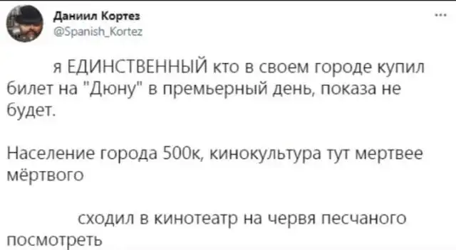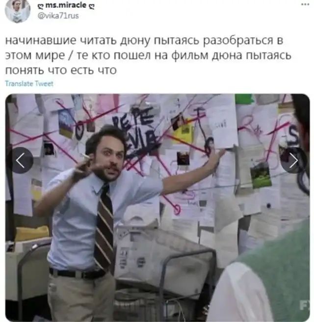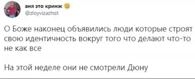 На днях в широкий прокат вышел долгожданный фильм Дени Вильнева "Дюна". Его ожидали и критики, и зрители. Пока что есть смешанные отзывы - три часа экшна многим зрителям пришлось по душе, другие же заявили: ничего непонятно, скучно и не интересно. Пока что никто не хочет раскрывать всех тайн фильма и поэтому постит мемы.