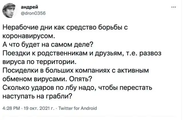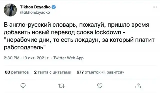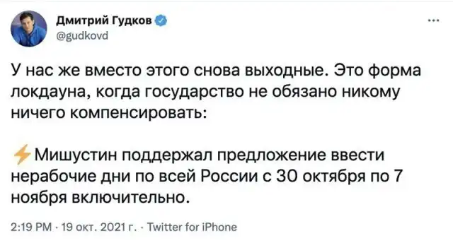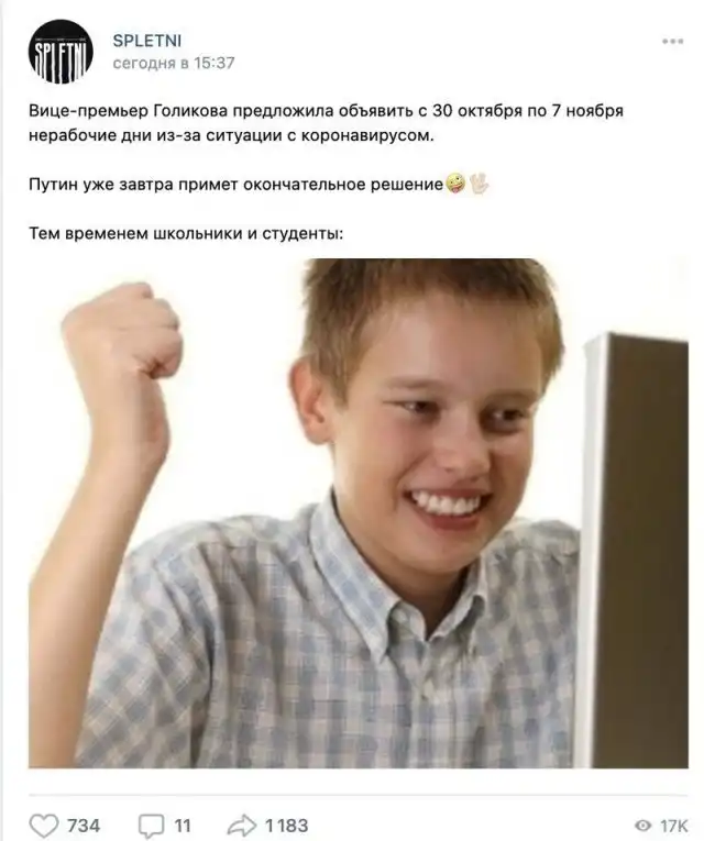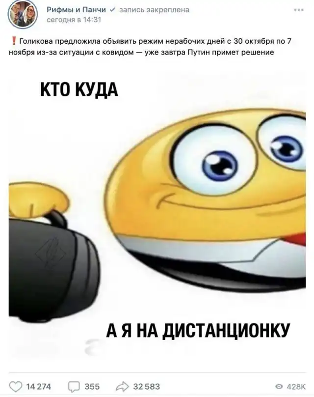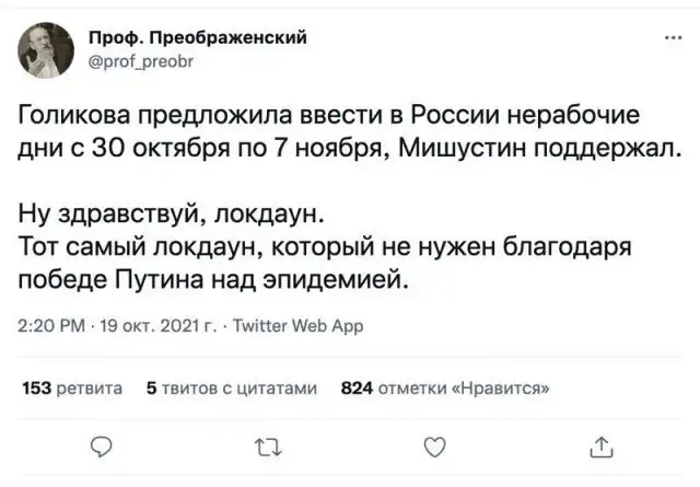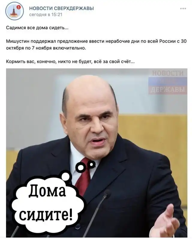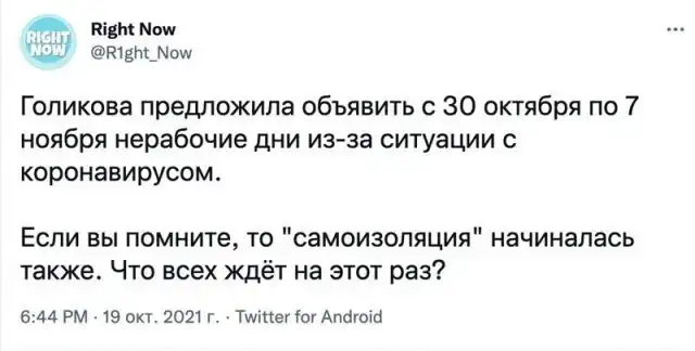 Как известно, ранее Татьяна Голикова предложила сделать нерабочими дни с 30 октября по 7 ноября. Все, как сообщается, из-за распространения коронавируса. Конечно, все понимают, что это бесполезные полумеры, поскольку вряд ли кто-то действительно будет сидеть дома. Кроме того, далеко не каждый россиянин может позволить себе работать из дома. Поэтому реакция на такую новость соответствующая.