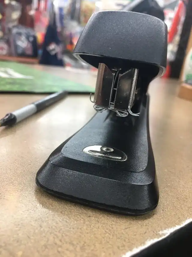 Мой коллега вернул степлер со стойки регистрации в таком виде. Сказал, что закончились скобы
