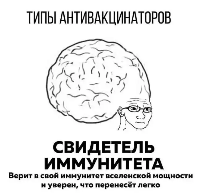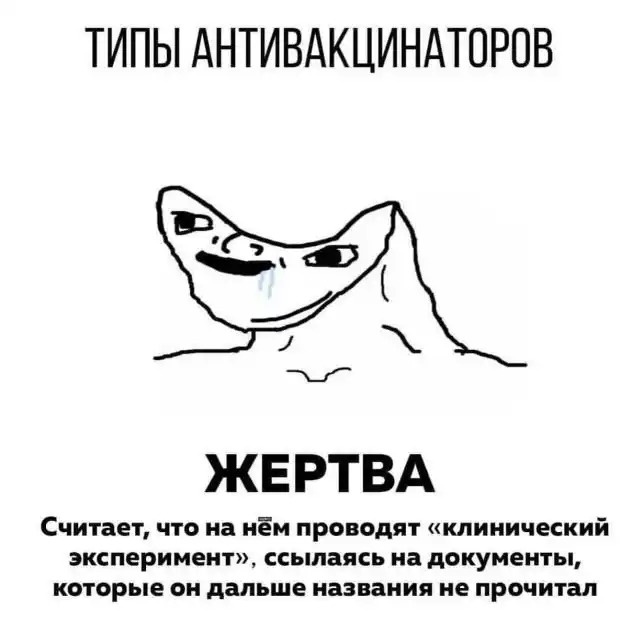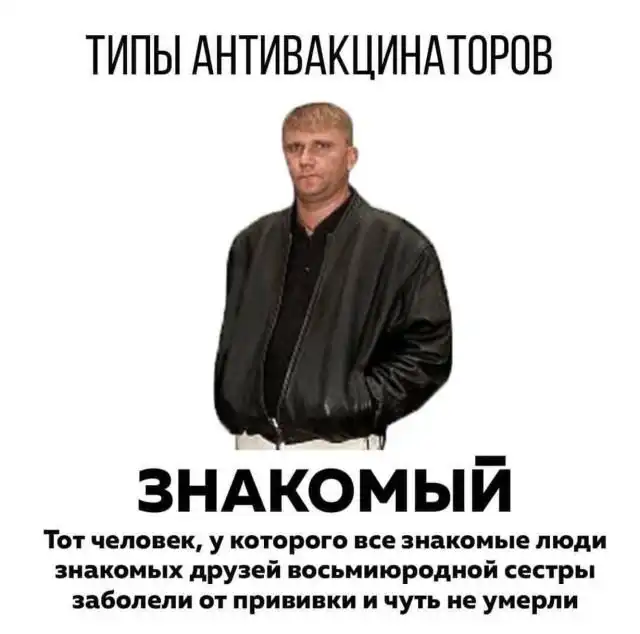 Кажется, что мы живем с коронавирусом уже целую вечность. И за это время народ на всей планете успел разделиться на два лагеря: на ваксеров и антиваксеров. Конечно же, по закону жанра, они терпеть друг друга не могут. Также "ученые" из Сети составили типологию антиваксеров и получилось довольно смешно (хотя и грустно одновременно). Ну что ж, выбирайте своего бойца. Мой тип, пожалуй, "Знакомый". Если что я не хотел задеть чувства антиваксеров, это просто юмор, заранее извиняюсь.