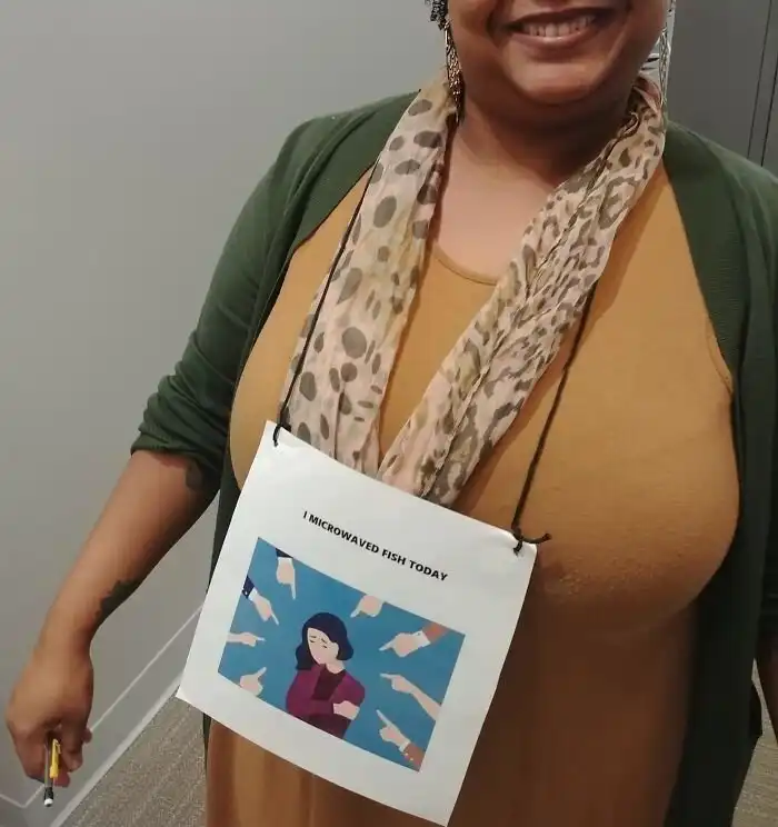 "Ненавижу накладывать на сотрудников взыскание перед праздниками, поэтому пошла на компромисс: моя подчиненная сегодня весь день проходила с этой табличкой"