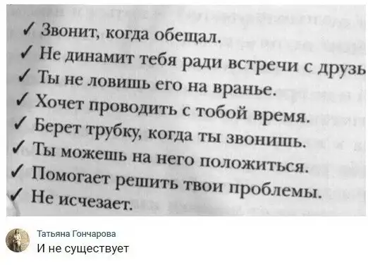 В идеальном мужчине прекрасно всё: он не опаздывает, не врёт, не бездельничает и... не существует.