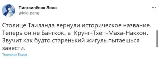 Власти Таиланда решили переименовать знаменитый город Бангкок. Теперь он будет называться Крунг Тхеп Маха Накхон. Тяжелое непроизносимое название невозможно выговорить с первого и со второго раза, и по этому поводу уже шутят пользователи. Кстати, это еще сокращенный вариант, он означает «Город ангелов, Великая столица». Полностью название столицы Таиланда, занесенное в Книгу рекордов Гиннесса, состоит из 168 знаков.