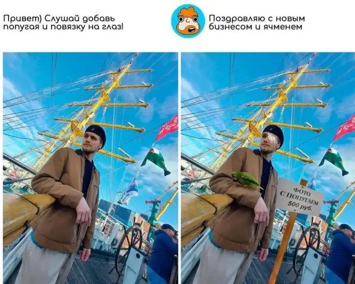 Делает это он в лучших традициях всех фотошеперов под девизом «Я художник, я так вижу». В целом, даже и придраться-то не к чему, ведь он слово в слово исполняет то, о чём его просят. По своему, но всё же. Да вы и сами можете в этом убедиться.