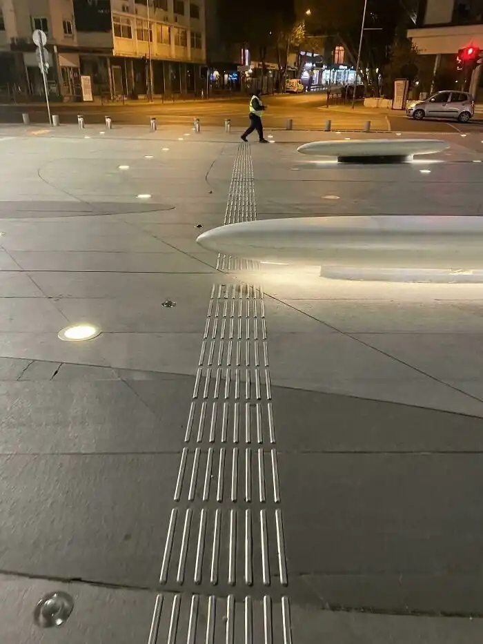 Тактильная дорожка для незрячих утыкается прямо в каменную скамью