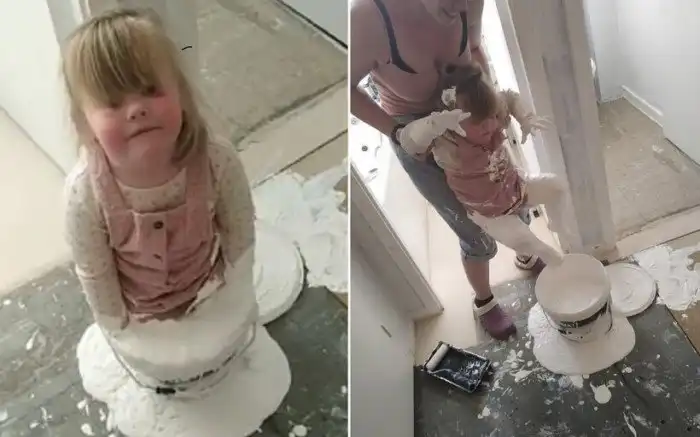 Двухлетняя девочка залезла в ведро с белой краской, пока её мама была занята ремонтом