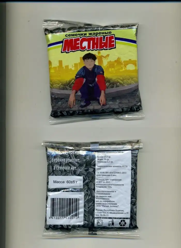 г. Улан-Удэ. На упаковке нарисован бурят-гопник на кортах, а на обороте написано «Штырь предупреждает: курение убивает, а семечки нет».Пельмени