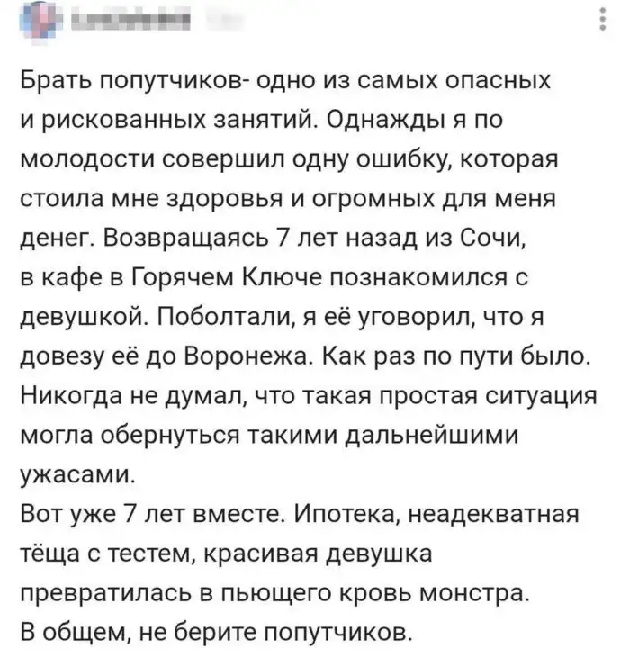 4. Одиноким людям на заметку... Не берите попутчиц