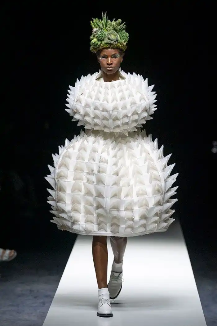 Необычный наряд был вдохновлён социальным дистанцированием, которое ещё совсем недавно было актуальным во многих странах. Мода по-своему интерпретировала это явление. Дизайнеры наперегонки принялись создавать коллекции одежды, имеющие широкие и массивные конструкции.