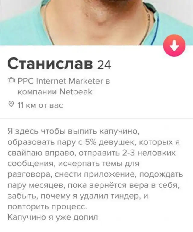 Эти люди проявляют смекалку и стараются понравиться тебе, чтобы ты обратил на них внимание в приложении для знакомств. Им скучно, грустно и некому что-то там подать. Поэтому смотри внимательно и выбирай!