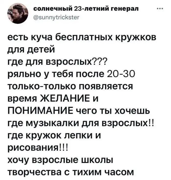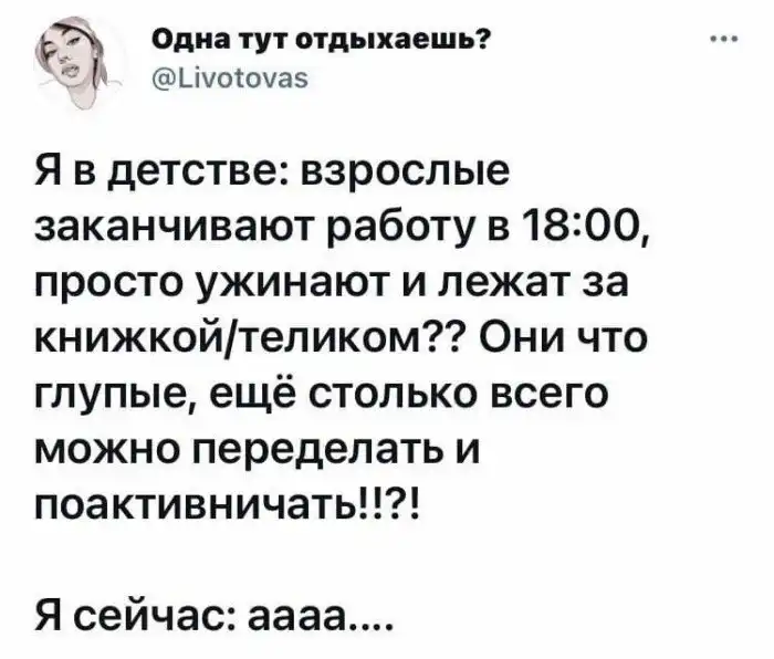 Очередной пост смешного "нытья" взрослых людей. Кто бы мог подумать, что взрослая жизнь — это жизнь от зарплаты до зарплаты. Лучшим же развлечением является глубокий и продолжительный сон.