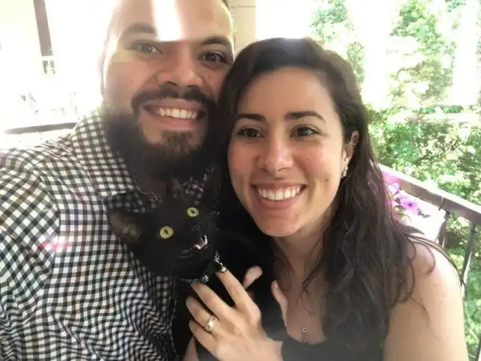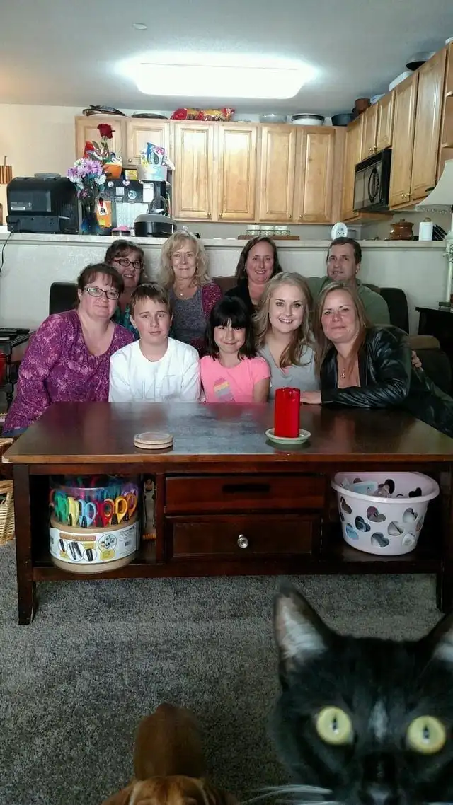 Нашла это старое семейное фото с фотобомбой кота. Собака тоже пыталась, но, будучи невысокого роста, не совсем справилась с задачей, забавно.
