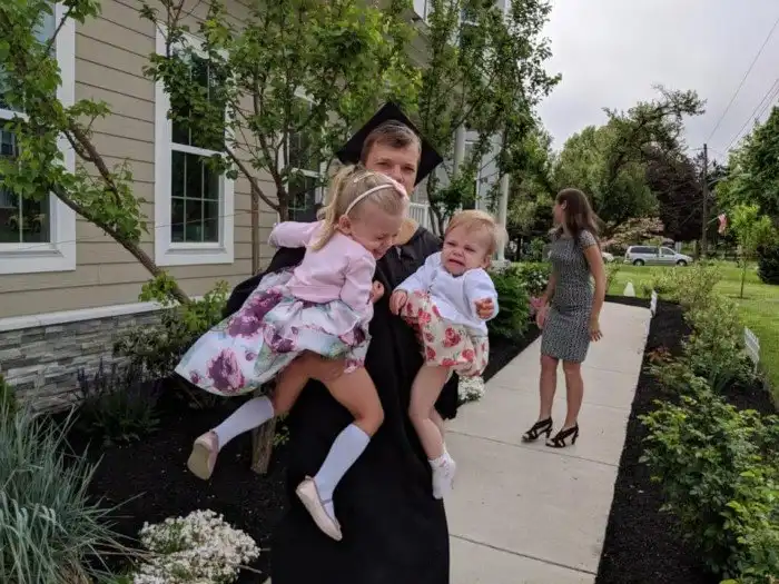 Сегодня я заканчиваю Университет Темпл спустя 15 лет, в течение которых я работал на полную ставку и не забывал про свою семью. Женился, 2 дочери, дом построил. Вот попытался сделать семейный снимок на свой выпускной.