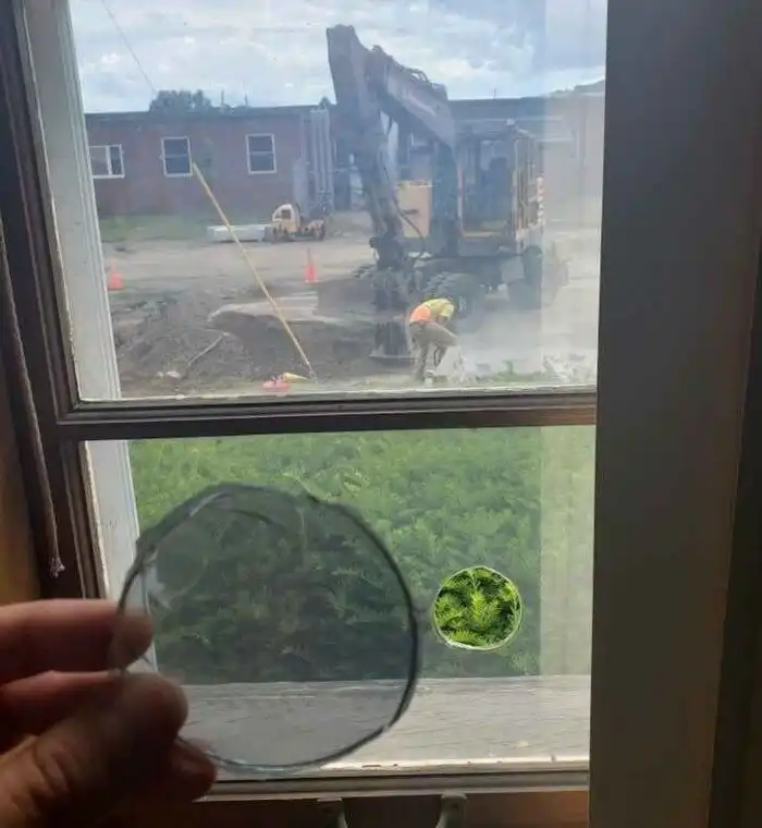 Кусок бетона отлетел, и сделал идеальную дырку в окне