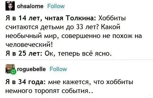 Чем старше становишься, тем больше понимаешь философию хоббитов из "Властелина колец". И всё больше понимаешь, что 30 лет – это только начало... начало конца.