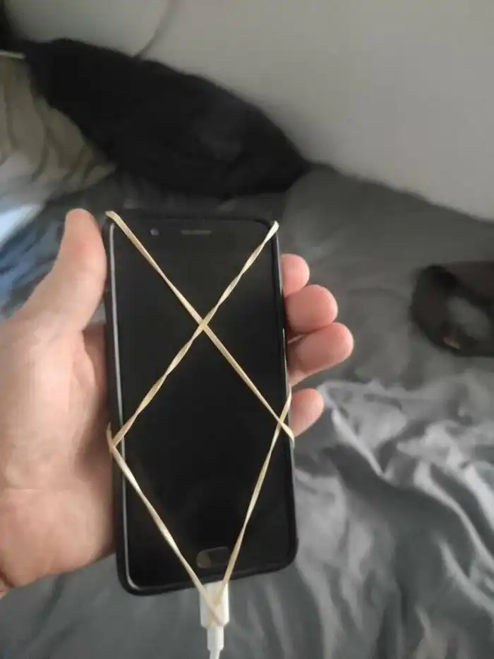 "Мой старый телефон с трудом заряжается. Приходится его вот так перевязывать"
