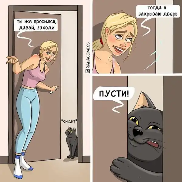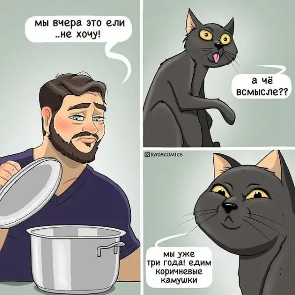 Для кого-то маленькая рыбка в аквариуме уже выглядит, как полноценный домашний зверинец. А есть и те, кому и двух кошек будет мало. Например, художница по имени Рада обожает своих домашних любимцев. Она даже посвятила им целый комикс. Собака Шаня и два кота по кличке Кирилл и Пурр являются для нее бескрайним источником позитива и вдохновения. Судя по ее комиксам, с этой компанией скучать не приходится.