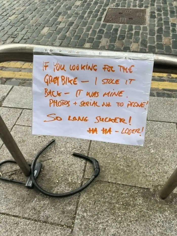 8. "Если ты ищешь серый велосипед, то я украл его обратно, ведь он был мой. Есть фотографии и серийный номер в качестве доказательства. Пока, неудачник!"