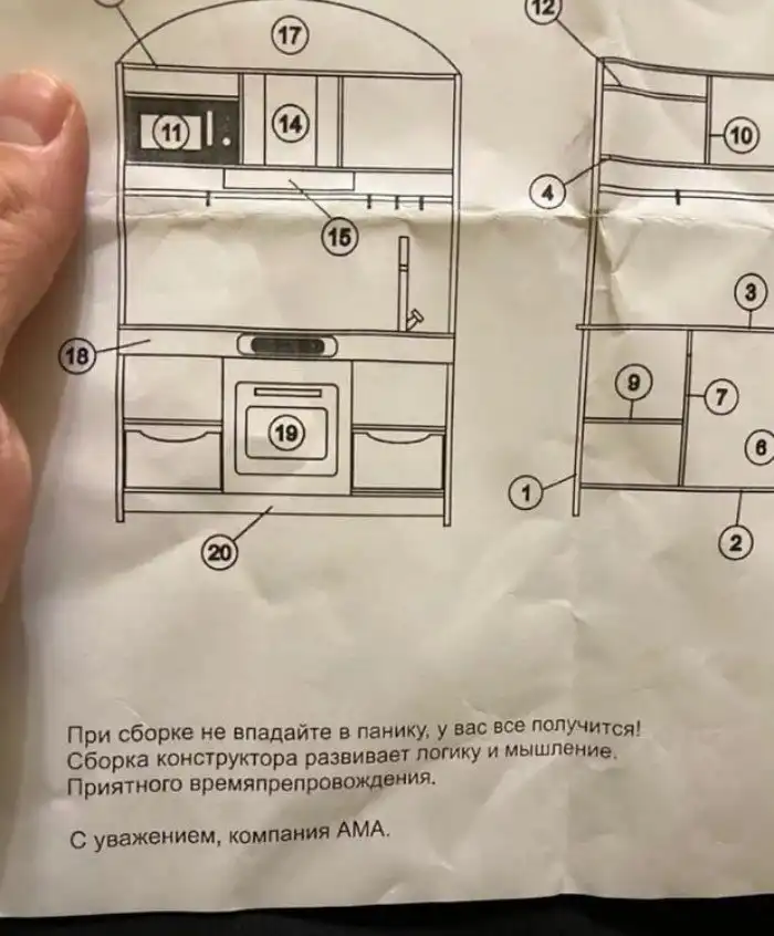 Купил игрушку для дочери. Кухня. Решил заняться сборкой. Инструкция сразу настраивает на позитивный лад.
