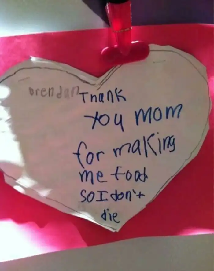 2. "Валентинка, которую я сделал для своей мамы в 5 лет: "Мама, спасибо, что готовишь для меня еду, чтобы я не умер"