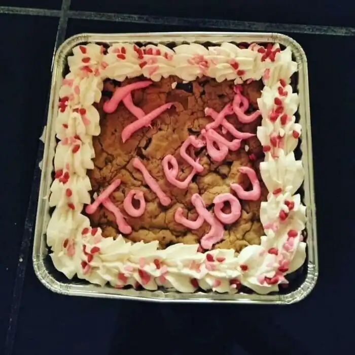 6. "Жена приготовила для меня торт на День Валентина. С надписью "Я терплю тебя"