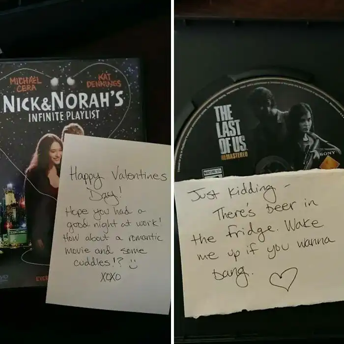 8. "С Днем Валентина! Надеюсь, хорошо поработал! Как насчет романтичного фильма и обнимашек? Ладно, шучу. В холодильнике пиво. Разбуди меня, если соскучишься"