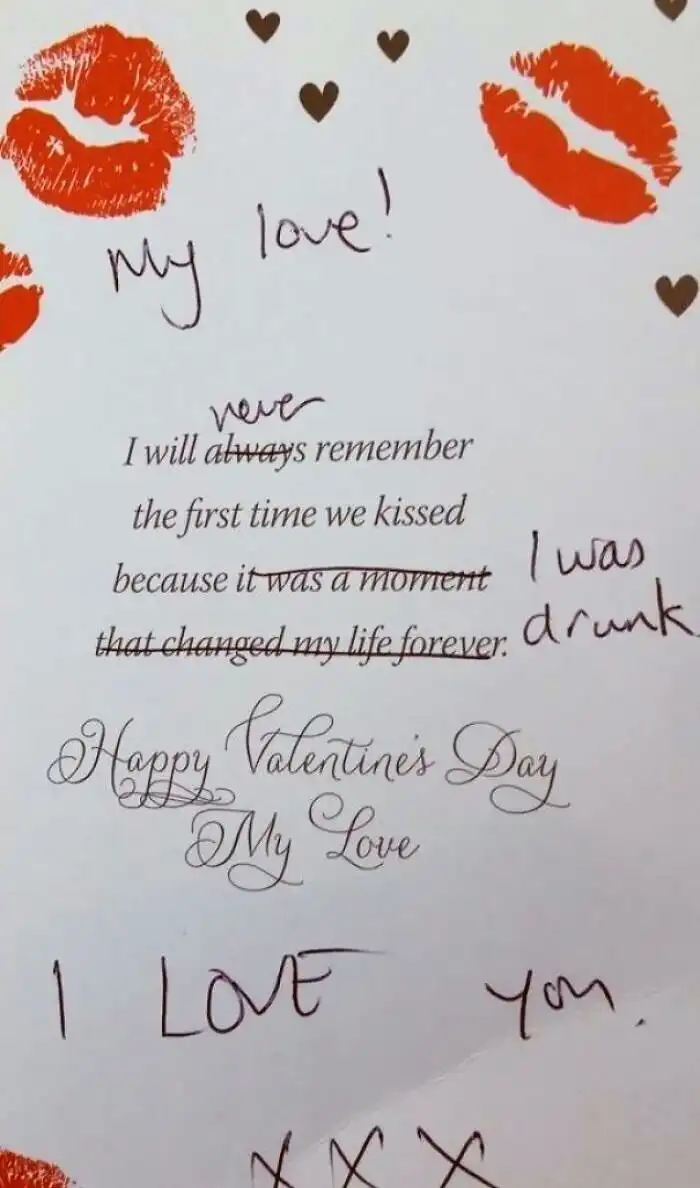 11. "Открытка, которую я купила для мужа и немного исправила. "Моя любовь! Я никогда не вспомню наш первый поцелуй, потому что я была пьяна" Зато честно"