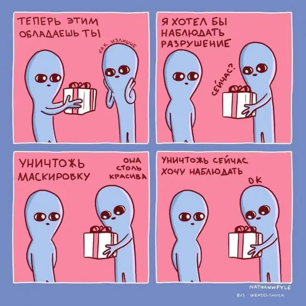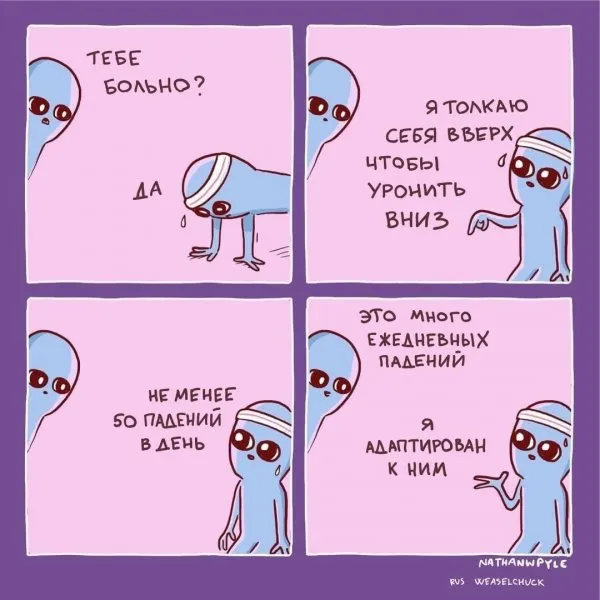 Вы уже знакомы с творчеством художника Нэйтана Пайла, который рисует забавные комиксы про инопланетян, которые пытаются жить как люди. Получается у них это с трудом, но они очень стараются. Давайте поднимем себе настроение и поглядим новую серию комиксов.