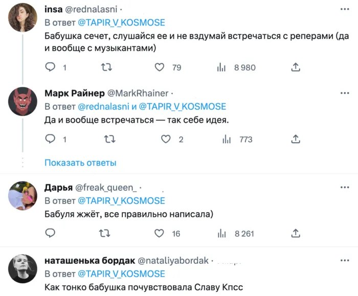 Для оценки потенциальных женихов внучка выбрала известных рэперов, комиков и блогеров, в том числе Славу КПСС и Оксимирона (Министерством юстиции РФ включён в список физлиц, выполняющих функции иноагента)