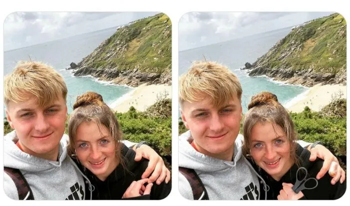 Это моё любимое фото меня с парнем, но здесь я держу его за палец и всё этим порчу. Можешь его убрать?