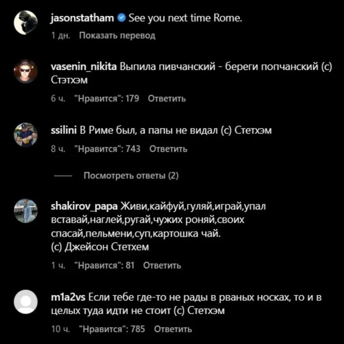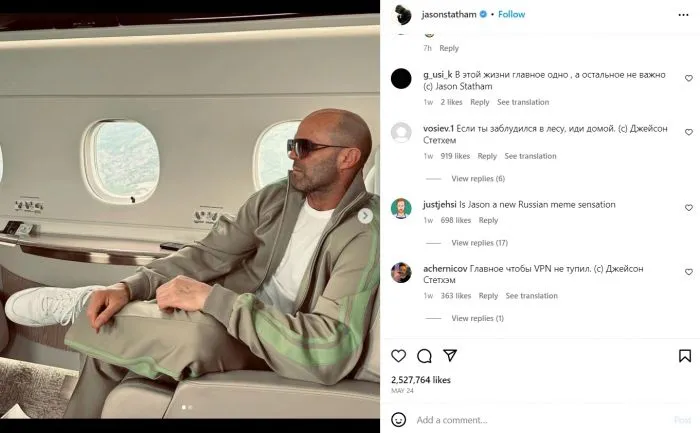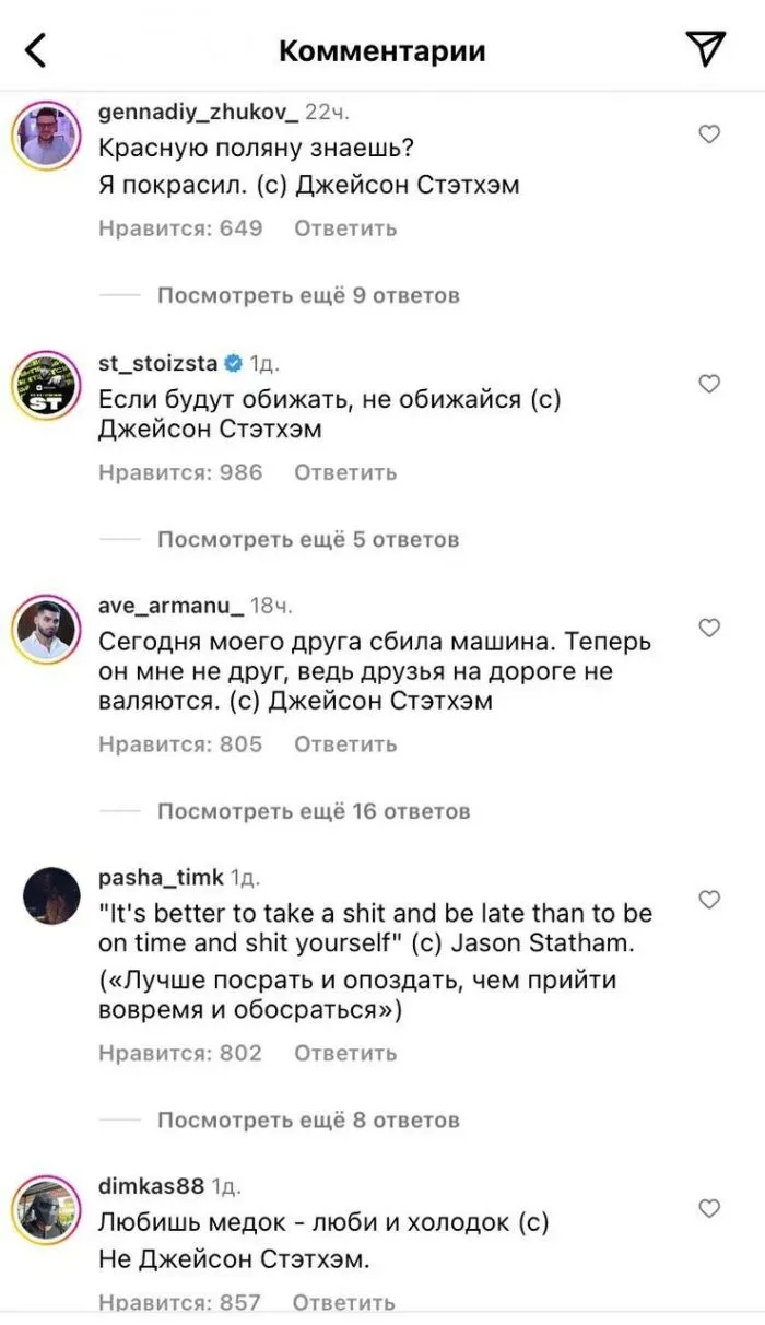 Похоже, Стейтем и сам не понимает, что происходит в комментариях его аккаунта в запрещенной сосети, хотя, конечно, не исключено, что какие-то из них он пытался переводить.